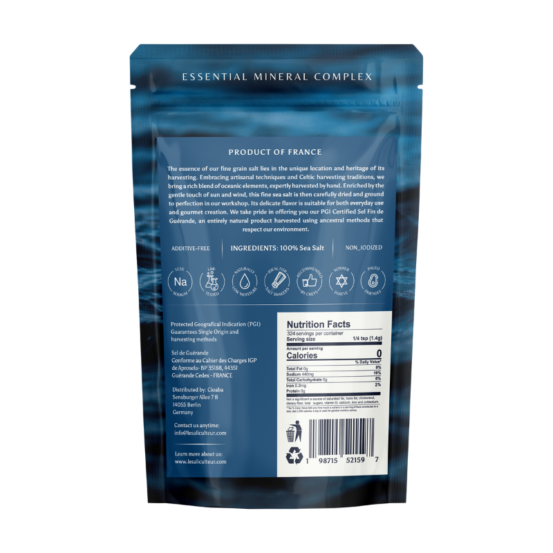 Enriched by the gentle touch of sun and wind, this fine sea salt is then carefully dried and ground to perfection in our workshop.